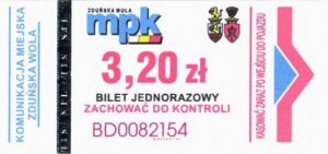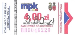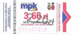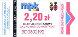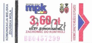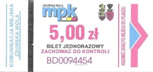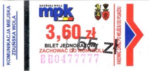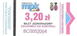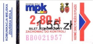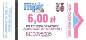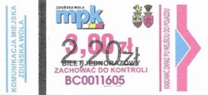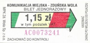 - Komunikacja Miejska – Zduńska Wola, cena w kolorowej strzałce, z tyłu hologram „trójkąty”, w tym podatek VAT: