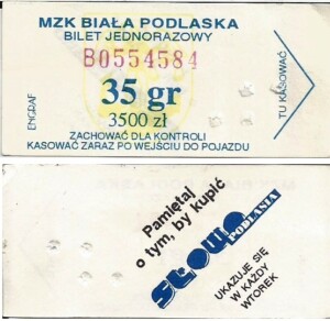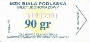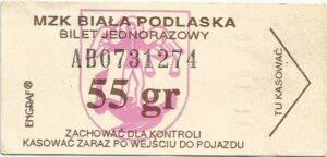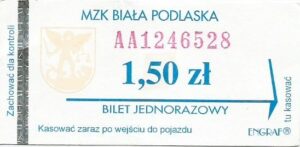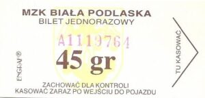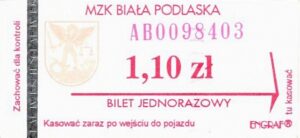 - MZK Biała Podlaska, w tle herb miasta, napis „TU KASOWAĆ” w strzałce, w lewym dolnym rogu napis „ENGRAF”: