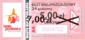 - Miasto Biała Podlaska, logotyp miasta, pasek holograficzny (na pasku w tle logotyp Rzeszowskiego Transportu Miejskiego):