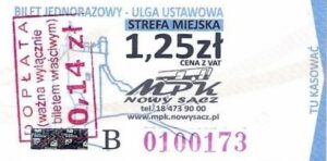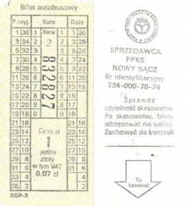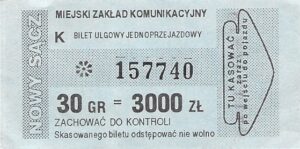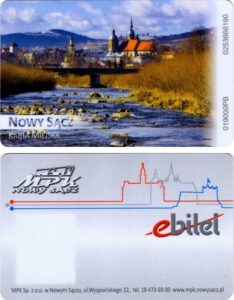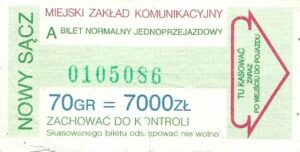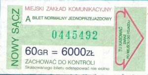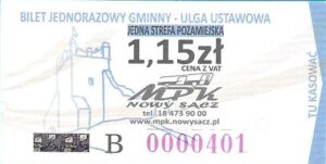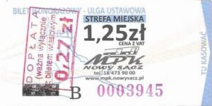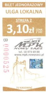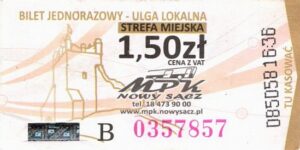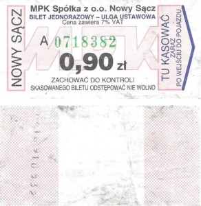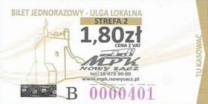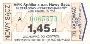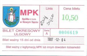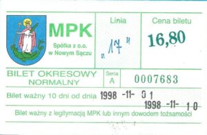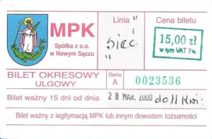 • Z lewej strony napis Nowy Sącz, w tle napis MPK, cena zawiera 7% VAT, MPK Sp. z o.o. Nowy Sącz: