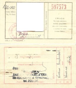 - Tło białe, rodzaj biletu opisany z lewej strony w prostokącie, cena zawiera 7% VAT, Zakład Miejskiej Komunikacji Samochodowej: