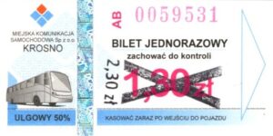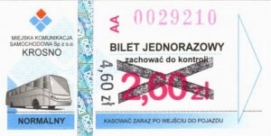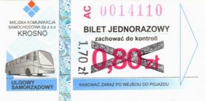 - Tło białe, rodzaj biletu opisany z lewej strony w prostokącie, cena zawiera 7% VAT, Miejska Komunikacja Samochodowa Sp. z o.o.: