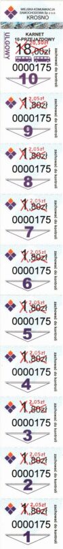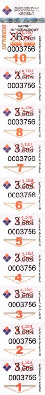 - Tło białe, logotyp autobusu, pomarańczowy numerator, hologram GRAF, cena zawiera 7% VAT, Miejska Komunikacja Samochodowa Sp. z o.o.: