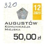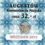 - Komunikacja miejska Augustów, herb miasta, w tle autobusy, numerator komputerowy, 50 lat komunikacji miejskiej: