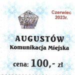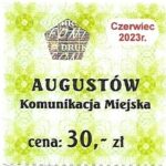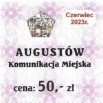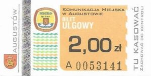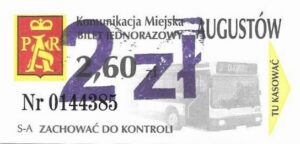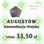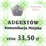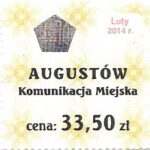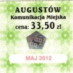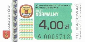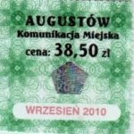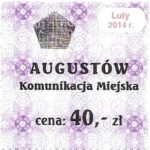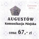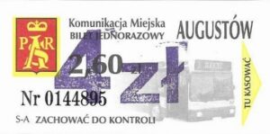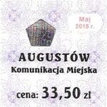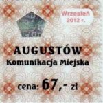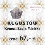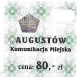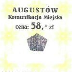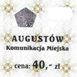 - Komunikacja miejska Augustów, herb miasta, w tle autobusy, numerator komputerowy: