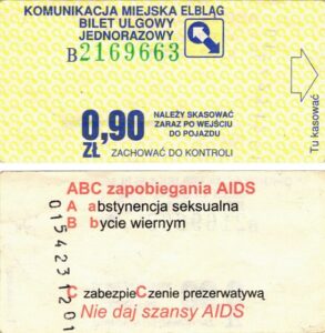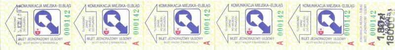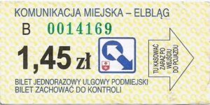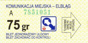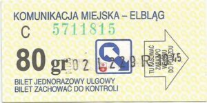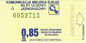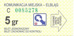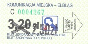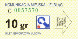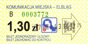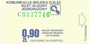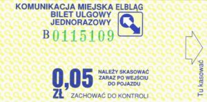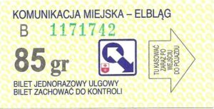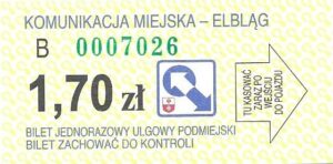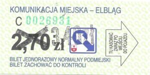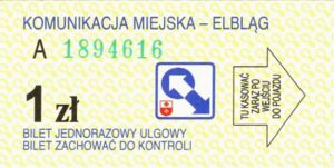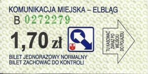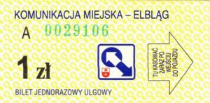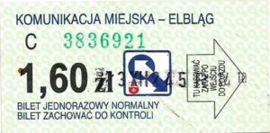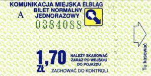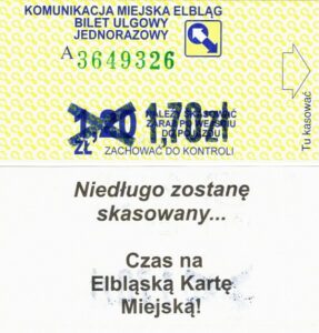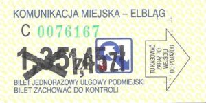 - Komunikacja Miejska Elbląg, nominał u dołu biletu, logo ZKM, w tle loga ZKM: