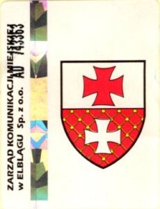 - W tle pasy, Komunikacja Miejska Elbląg, logo ZKM, Cz.Z.G.: