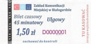 - Zakład Komunikacji Miejskiej w Białogardzie, numerator komputerowy pogrubiony, hologram GENUINE ORIGINAL z wygrawerowanymi napisami „SIL”: