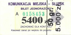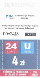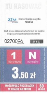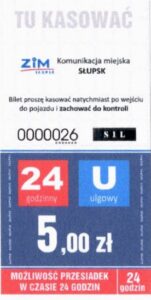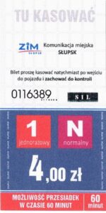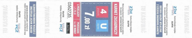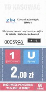 - Komunikacja Miejska Słupsk, logo ZIM, informacje o ważności biletu, hologram GENUINE ORIGINAL z wyciętym napisem SIL: