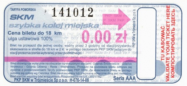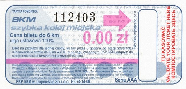 Uwaga: z dniem 11 grudnia 2022 SKM w Trójmieście przestała obsługiwać linię do Kościerzyny oraz linię PKM (w stopce biletu została usunięta między innymi Kościerzyna)