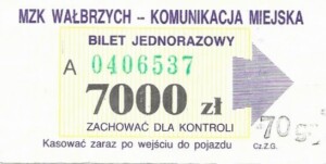 - Komunikacja Miejska w Wałbrzychu, herb miasta, logo ZDiK pod ceną, pomarańczowy numerator, srebrny hologram, w tym 7% VAT: