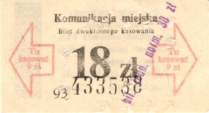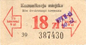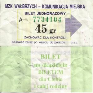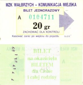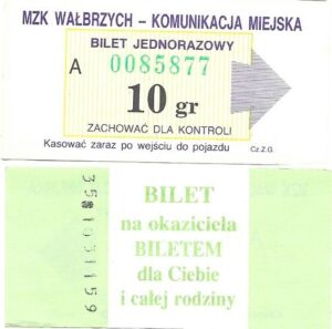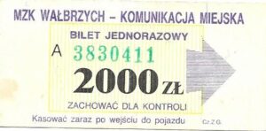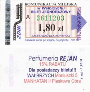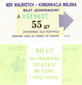 - Komunikacja Miejska w Wałbrzychu, herb miasta, różowy numerator, hologram „równoległoboki” + w tle napis HOLOGRAF, w tym VAT: