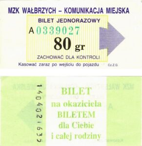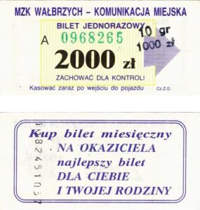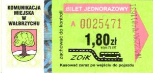 - Komunikacja Miejska w Wałbrzychu, herb miasta, logo ZDiK pod ceną, pomarańczowy numerator, hologram „trójkąty”, w tym 7% VAT: