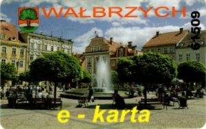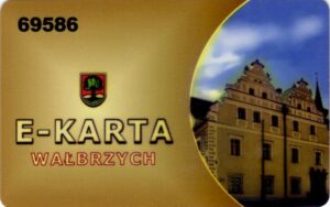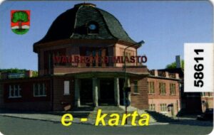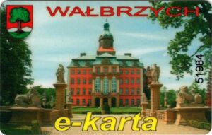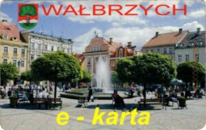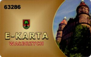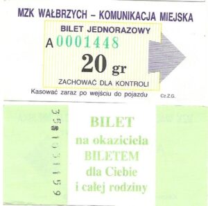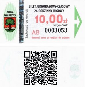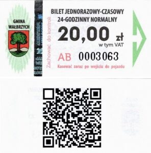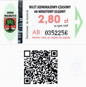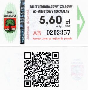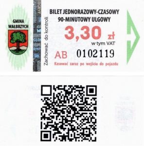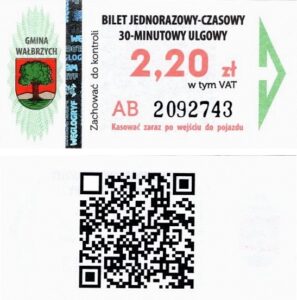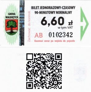 - Gmina Wałbrzych, herb miasta z lewej strony, na rewersie kod QR służący skasowaniu biletu, hologram WĘGLOGRYF, w tym VAT: