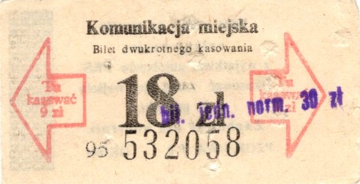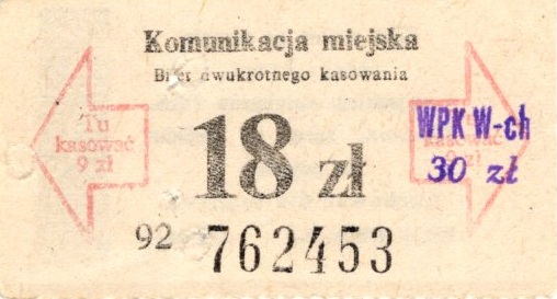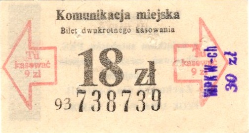 - Komunikacja Miejska w Wałbrzychu, herb miasta, różowy numerator, hologram „równoległoboki” + w tle napis HOLOGRAF, w tym VAT: