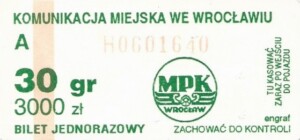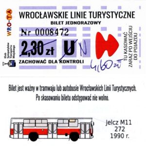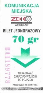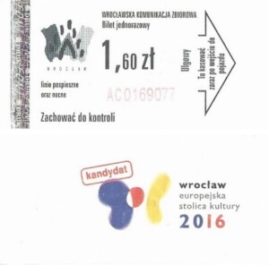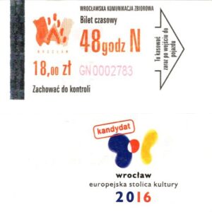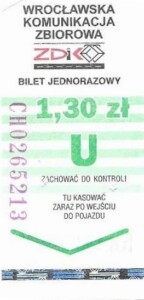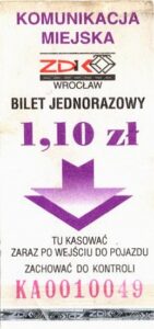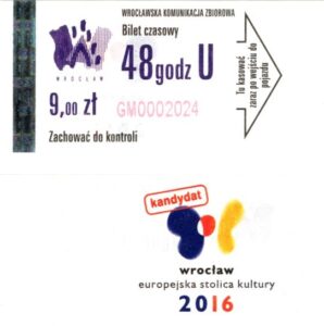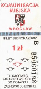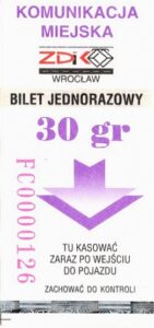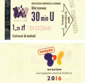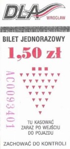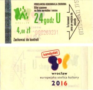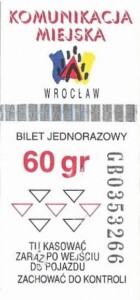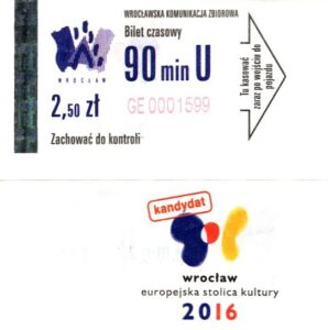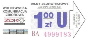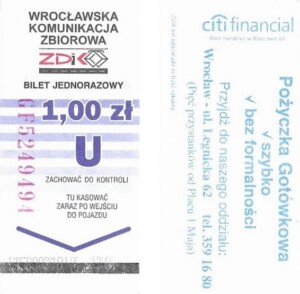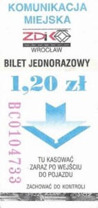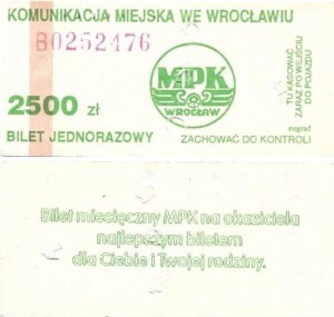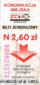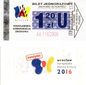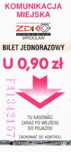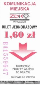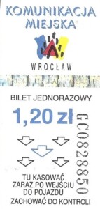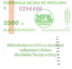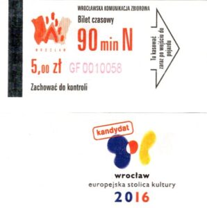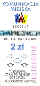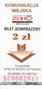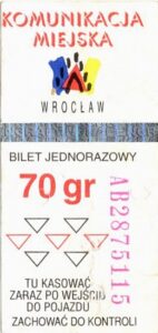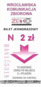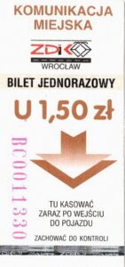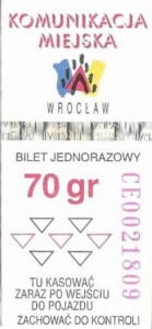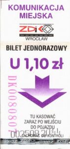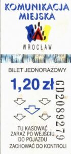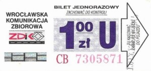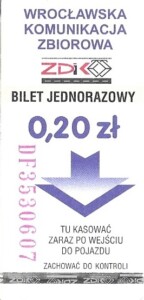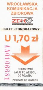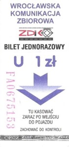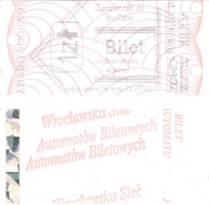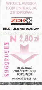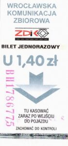 - Wrocławska Komunikacja Zbiorowa, logotyp miasta, cena na tle, hologram z logotypami ZDiK Wrocław oraz logiem miasta:
