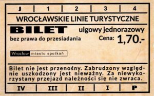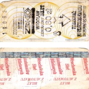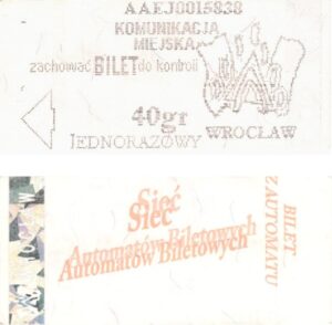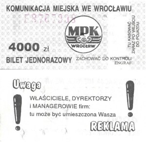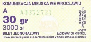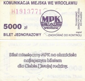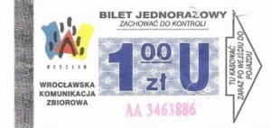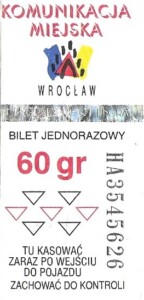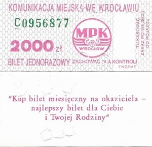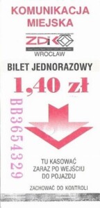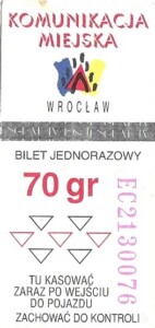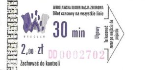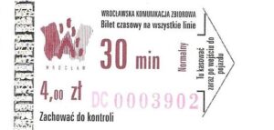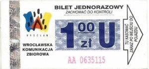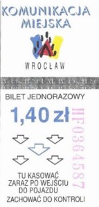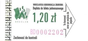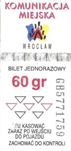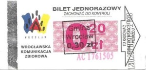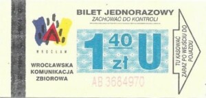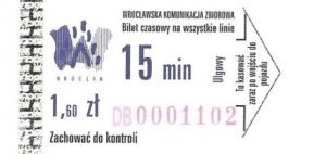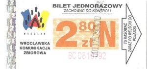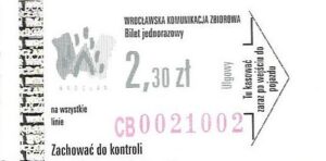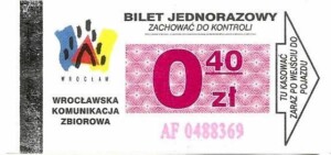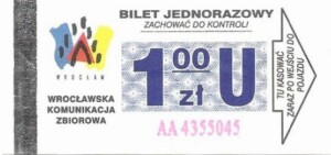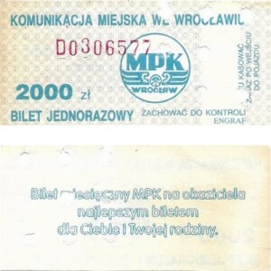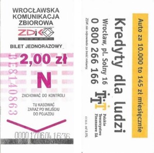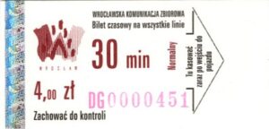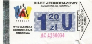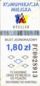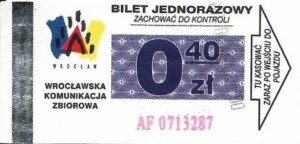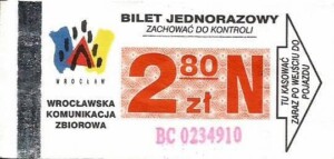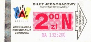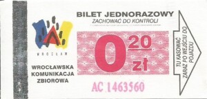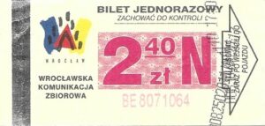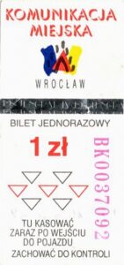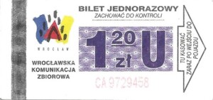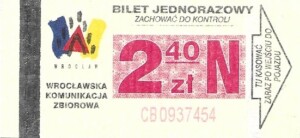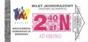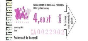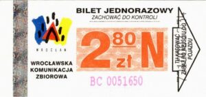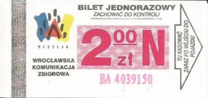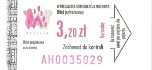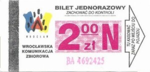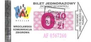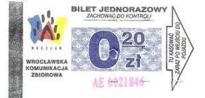- Wrocławska Komunikacja Zbiorowa, logotyp miasta, cena pod logotypem, hologram DrukFont: