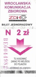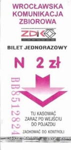 - Wrocławska Komunikacja Zbiorowa, logotyp miasta, cena pod logotypem, hologram z logotypami ZDiK Wrocław oraz logiem miasta: