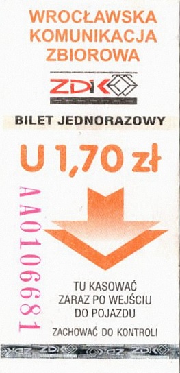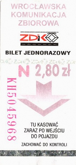 - Wrocławska Komunikacja Zbiorowa, logotyp miasta, cena na tle, hologram z logotypami ZDiK Wrocław oraz logiem miasta: