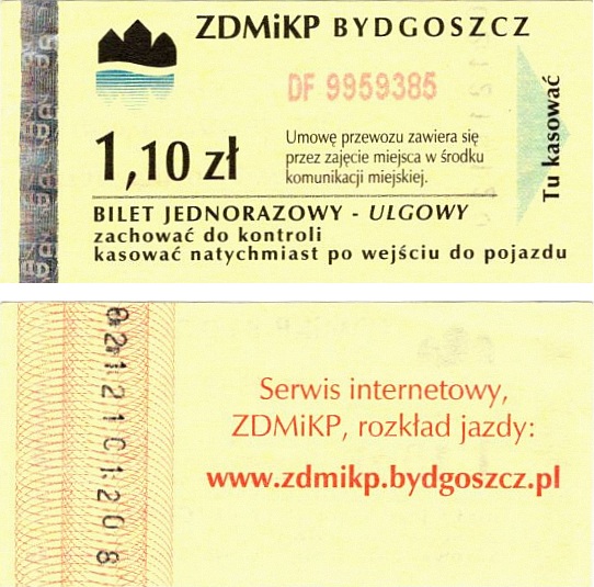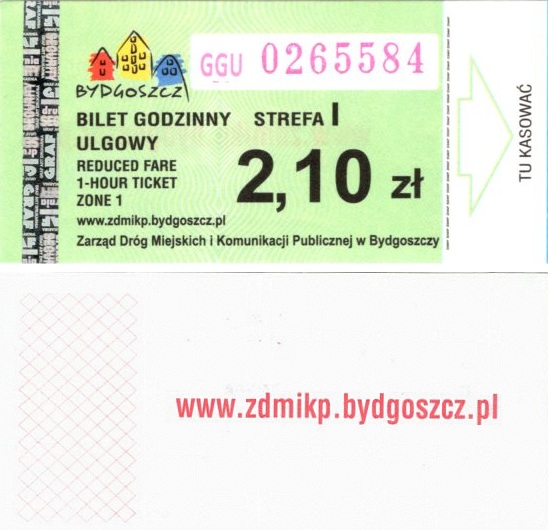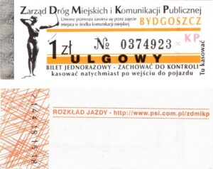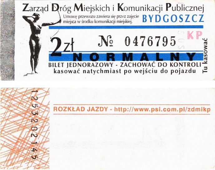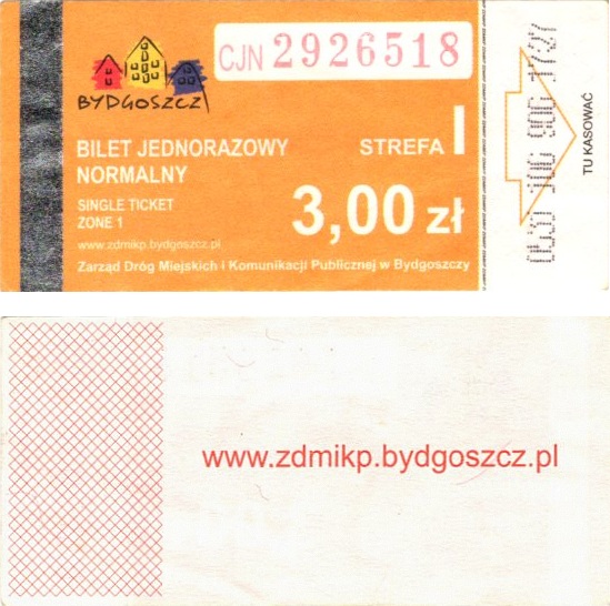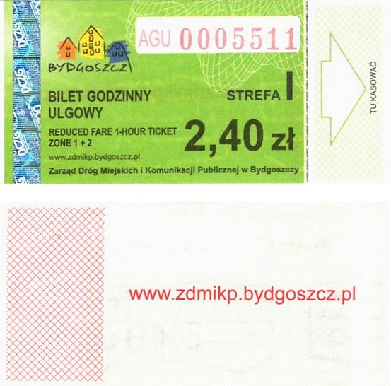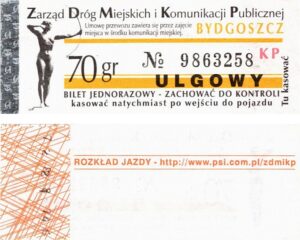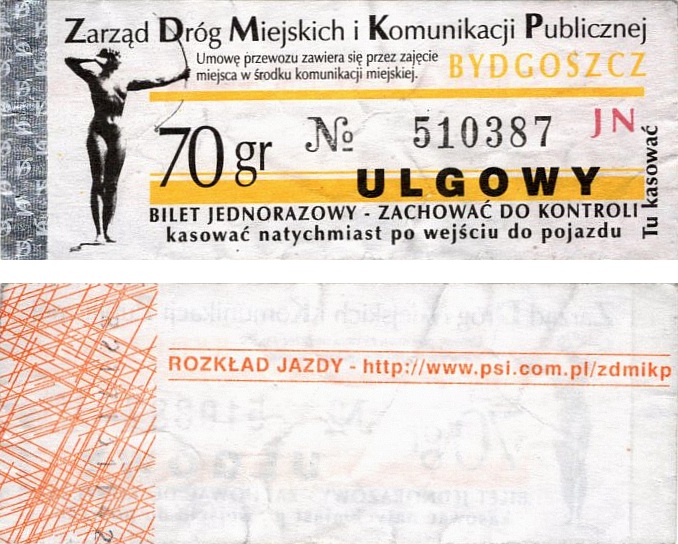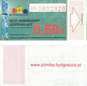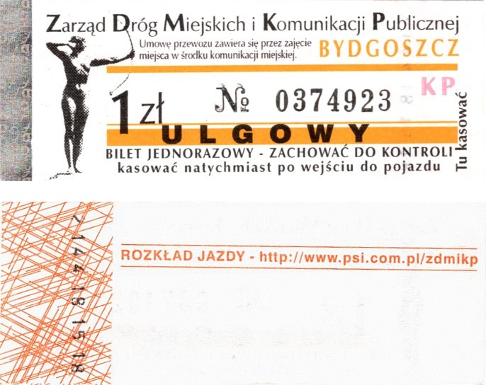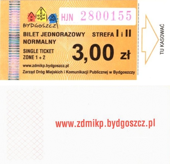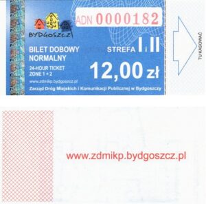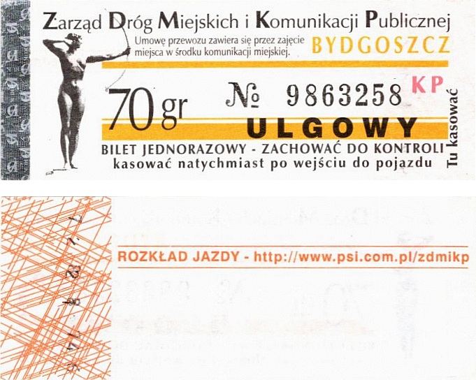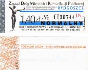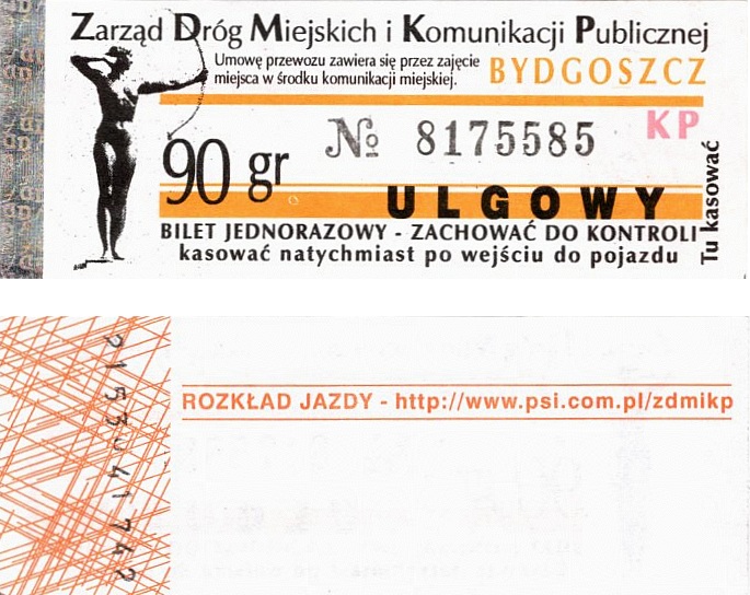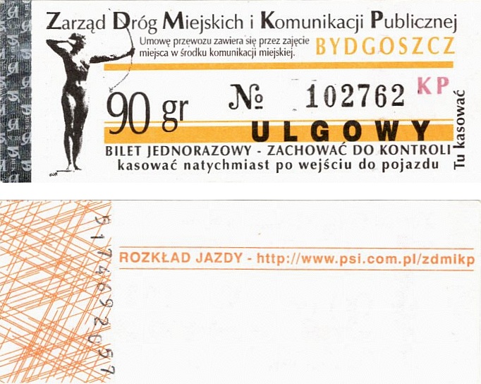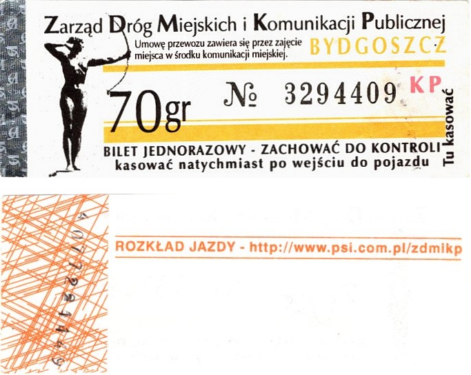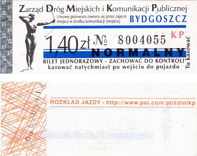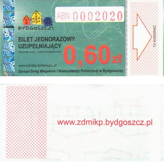 - Zarząd Dróg Miejskich i Komunikacji Publicznej w Bydgoszczy, pomnik Łuczniczki, ULGOWY/NORMALNY, hologram DrukFont (zmodyfikowany):