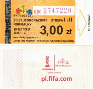 - Tło jednolite, logo miasta, mikrodruk w górnej części biletu, hologram CZG Ochrona: