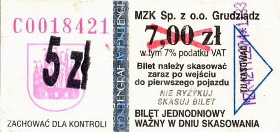 - MZK Sp. z o.o. w Grudziądzu, herb miasta z lewej strony biletu, w tym 7% podatku VAT: