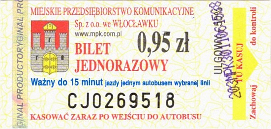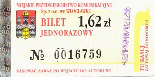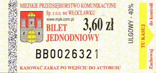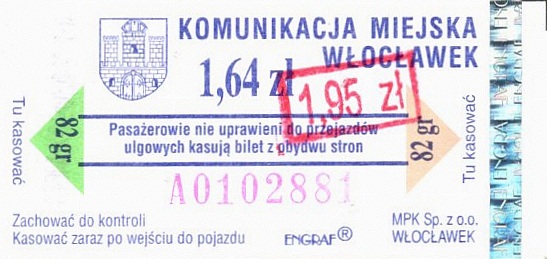 - Komunikacja Miejska – Włocławek, w tle herb miasta, w prawym dolnym rogu napis engraf: