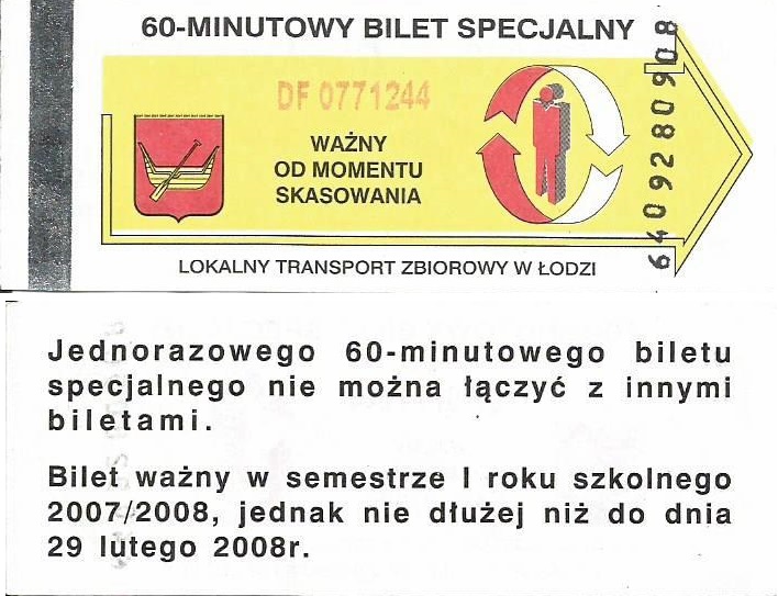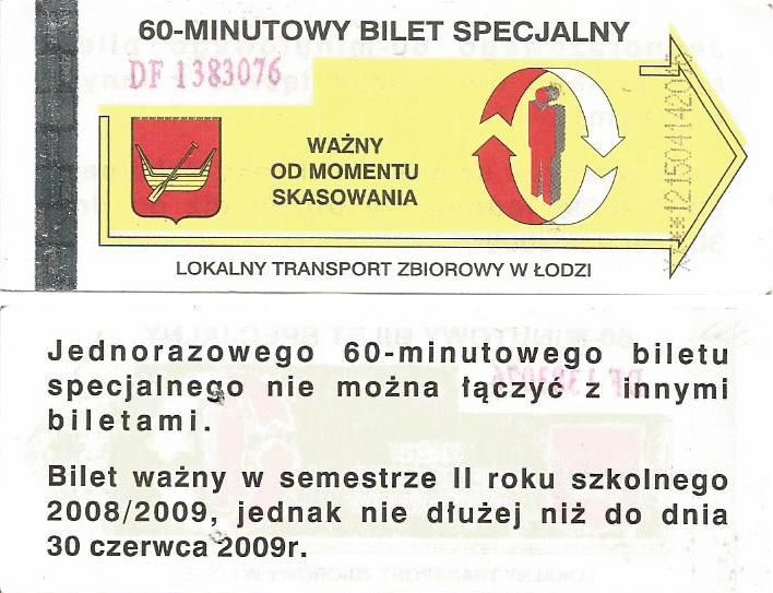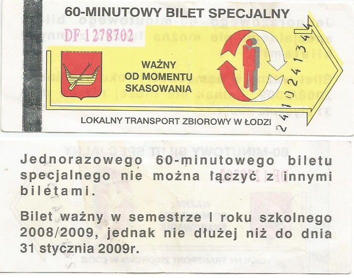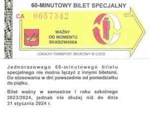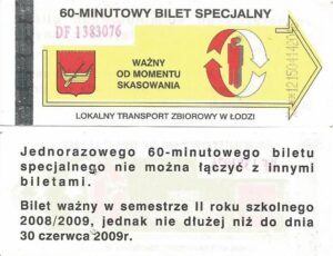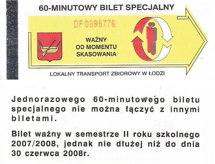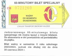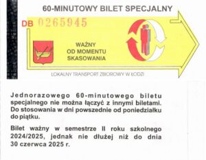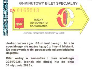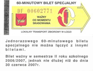 Bilety specjalne są w starej szacie graficznej, logotyp miasta, hologram z herbami miasta + podpis „ZDiT”, numerator pomarańczowy (u góry biletu):
