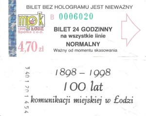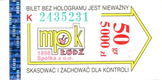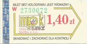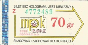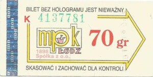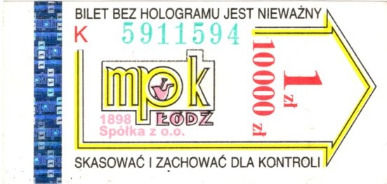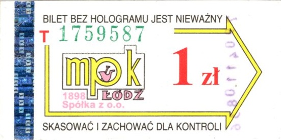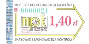 - 01.11.1995-30.03.1996, logo MPK Łódź (pod logiem podpis: 1998, Spółka z o.o.), hologram z logotypami MPK Łódź: