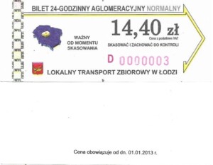- 01.01.2013-01.04.2017, logotyp miasta, hologram z herbami miasta + podpis „ZDiT”, numerator pomarańczowy (u dołu biletu), cena z podatkiem VAT: