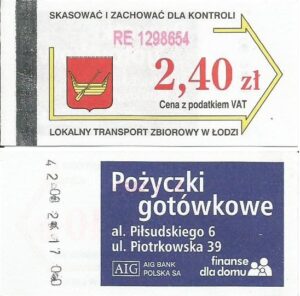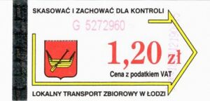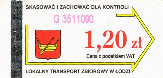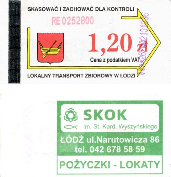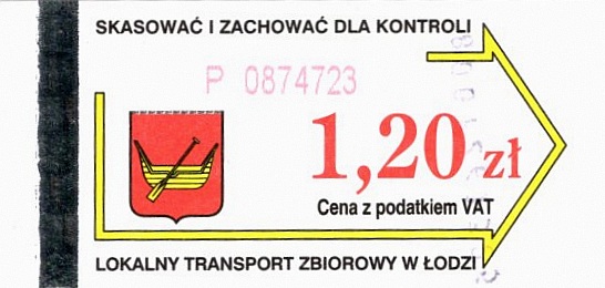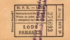 - Cena w strzałce, logotyp MPK Łódź oraz herb miasta Pabianice: