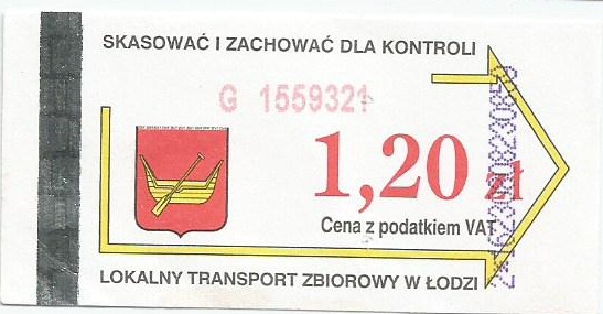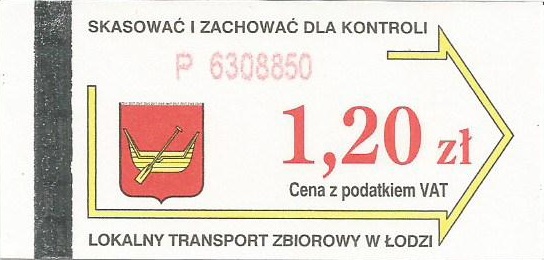 • Cena w strzałce, logotyp MPK Łódź oraz herb miasta Pabianice: