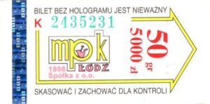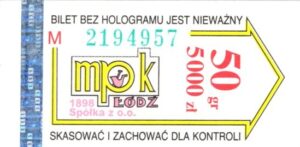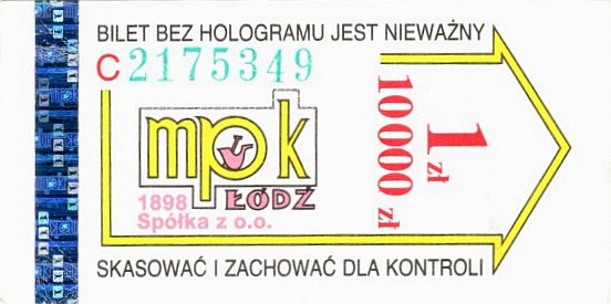 - 01.03.2000-31.03.2001, logo MPK Łódź, hologram z logotypami MPK Łódź, cena z podatkiem VAT: