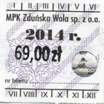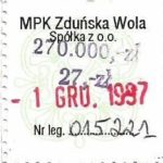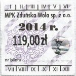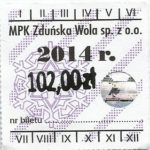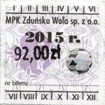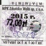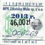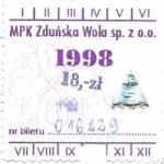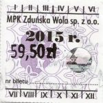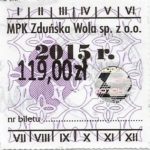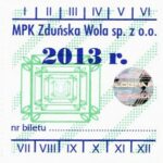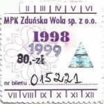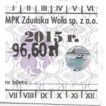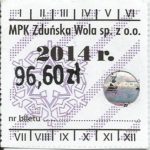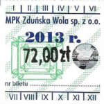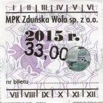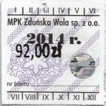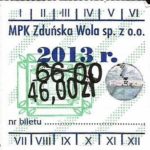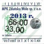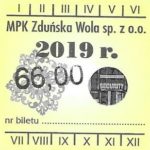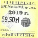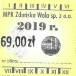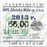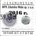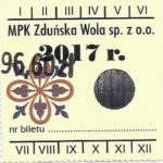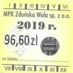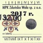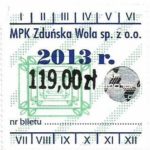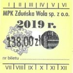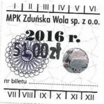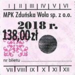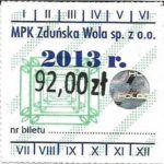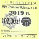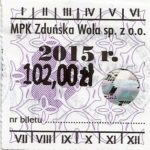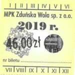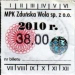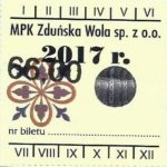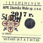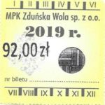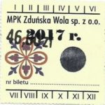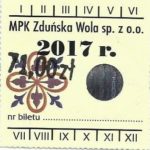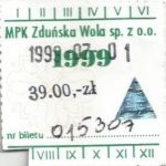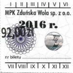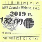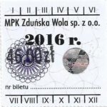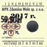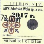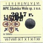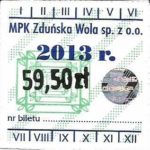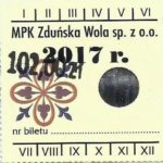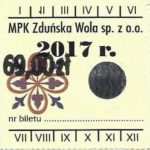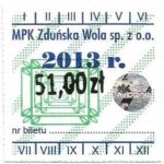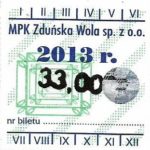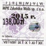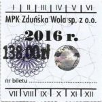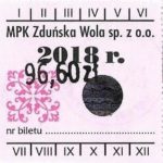 - Herb miasta, logo MPK, cienki numerator komputerowy, hologram GENUINE ORIGINAL z prawej strony napisu „Komunikacja Miejska – Zduńska Wola”:
