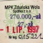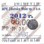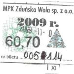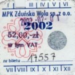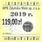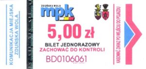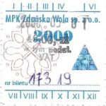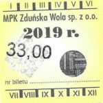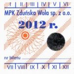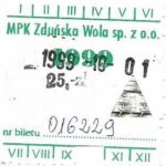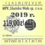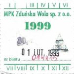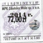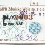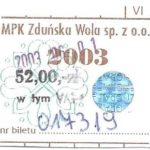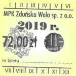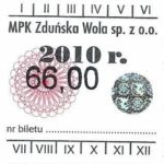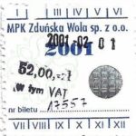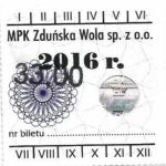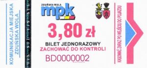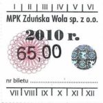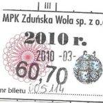 - Komunikacja Miejska – Zduńska Wola, cena w kolorowej strzałce, z tyłu hologram „trójkąty”, w tym podatek VAT: