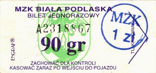 - MZK Biała Podlaska, w tle herb miasta, napis „TU KASOWAĆ” w strzałce, w lewym dolnym rogu napis „ENGRAF”: