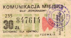 • Komunikacja Miejska, w tle herb miasta, napis „TU KASOWAĆ” w trójkącie, w prawym dolnym rogu napis „ENGRAF”: