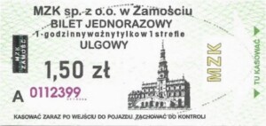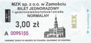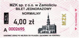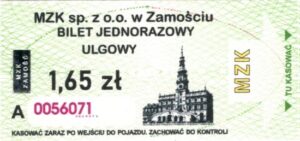 - Ratusz miejski, MZK Sp. z o.o. Zamość, hologram DrukFont z wytłoczonym napisem MZK ZAMOŚĆ: