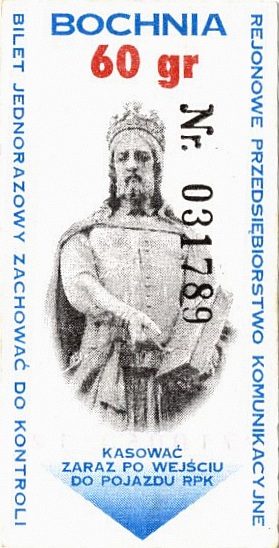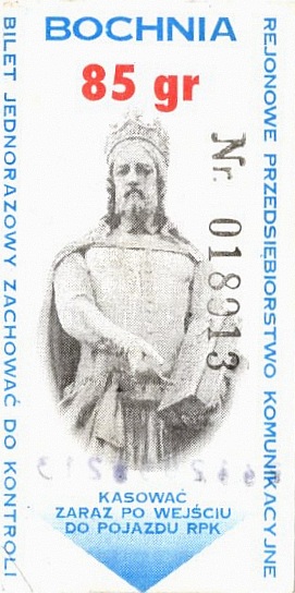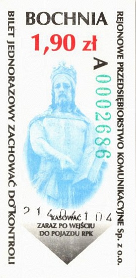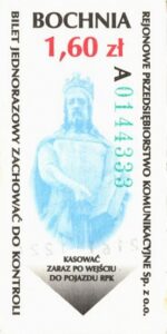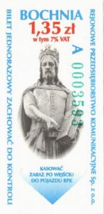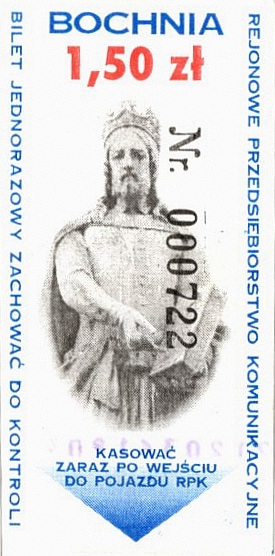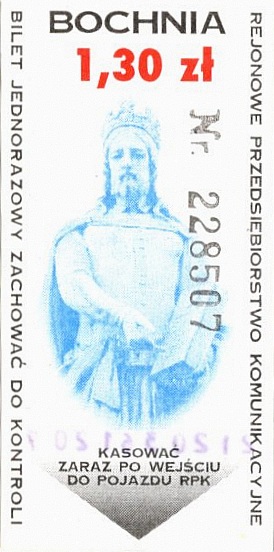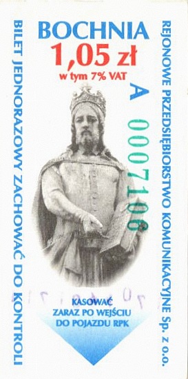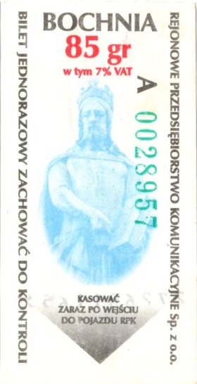 - W tle pomnik Kazimierza Wielkiego, w tym 7% VAT, Rejonowe Przedsiębiorstwo Komunikacyjne Sp. z o.o.: