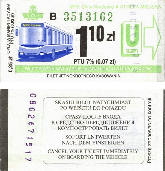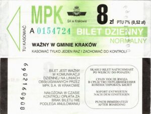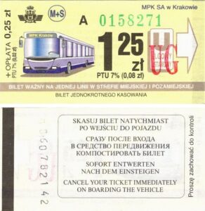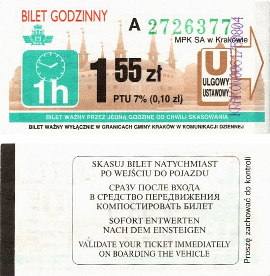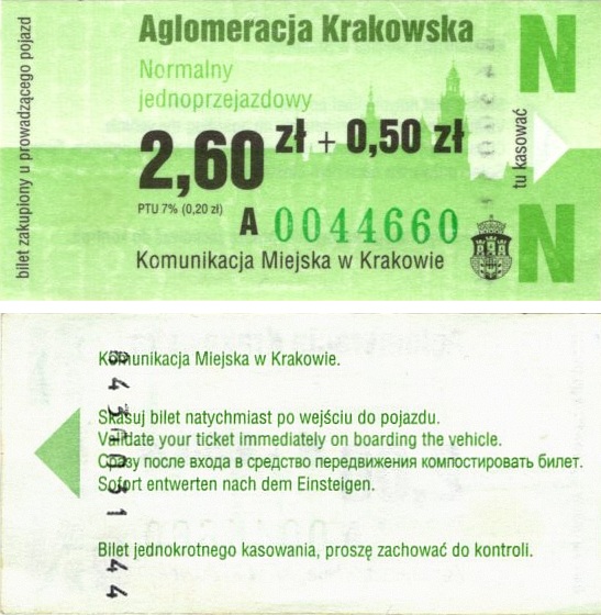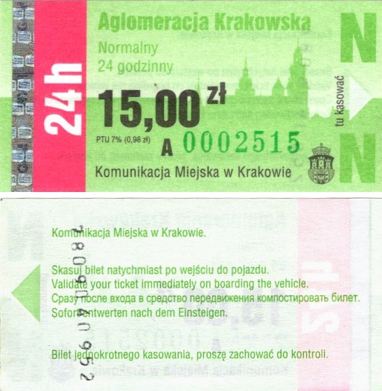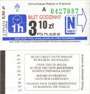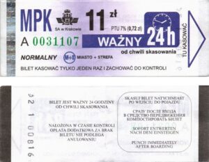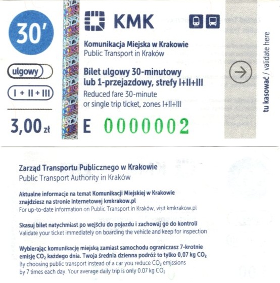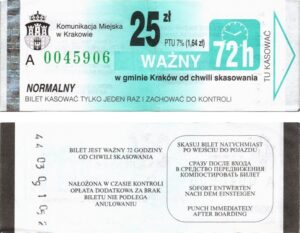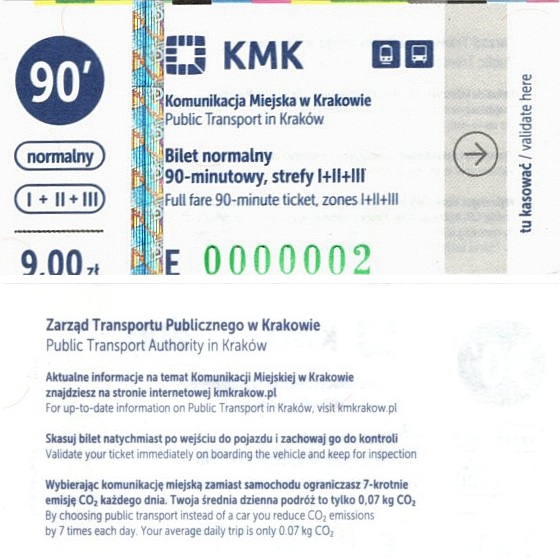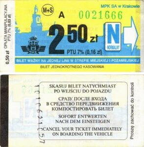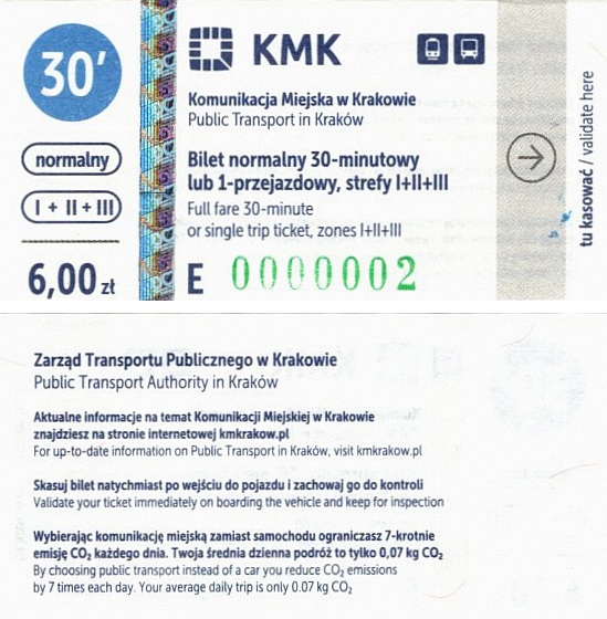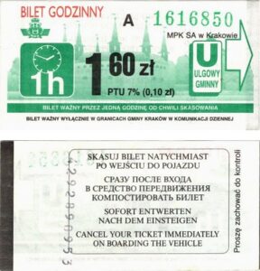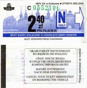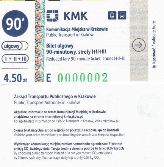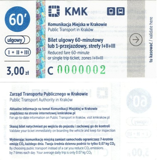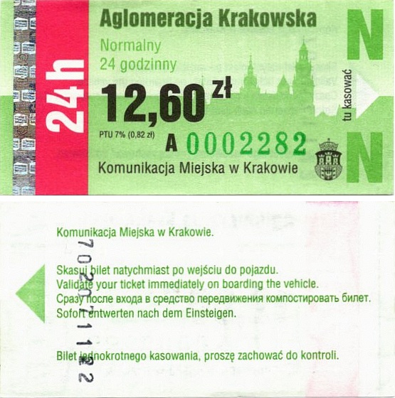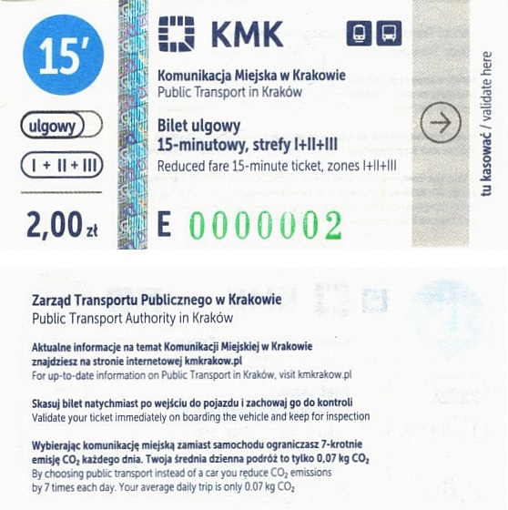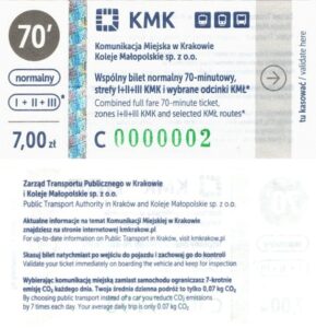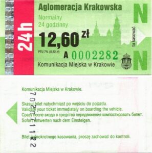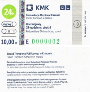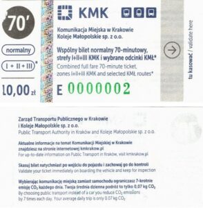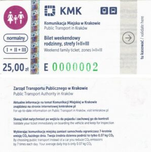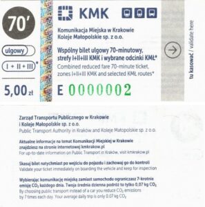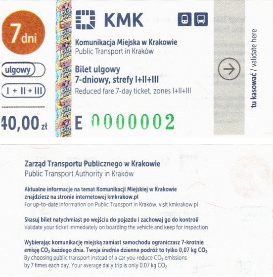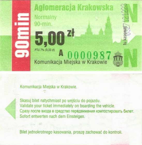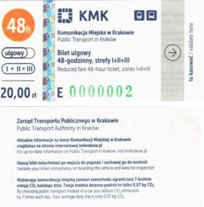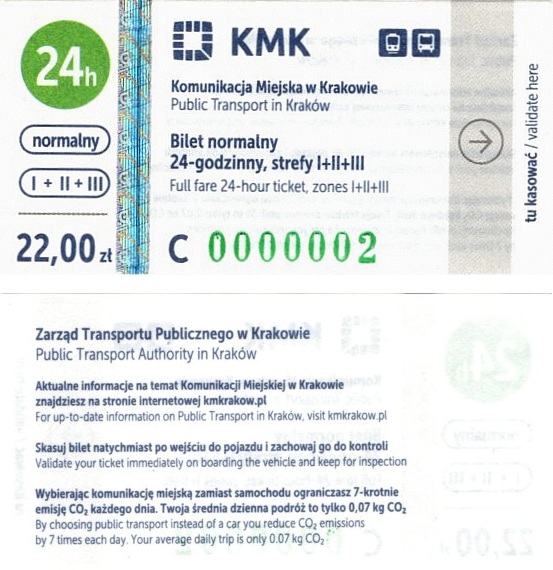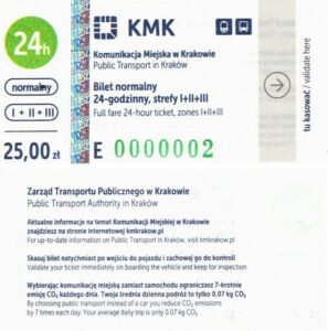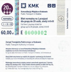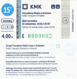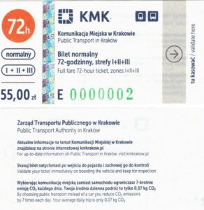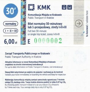- W tle kontury katedry na Wawelu [tło niebieskie dla biletów na Miasto Kraków, zielone dla Aglomeracji], błędny herb miasta (tzw. sedes), bez informacji o VAT, pole na wydruk kasownika: