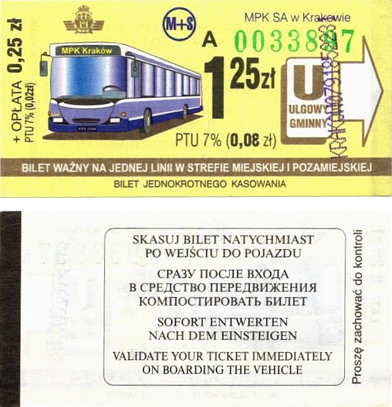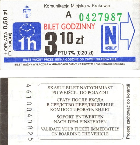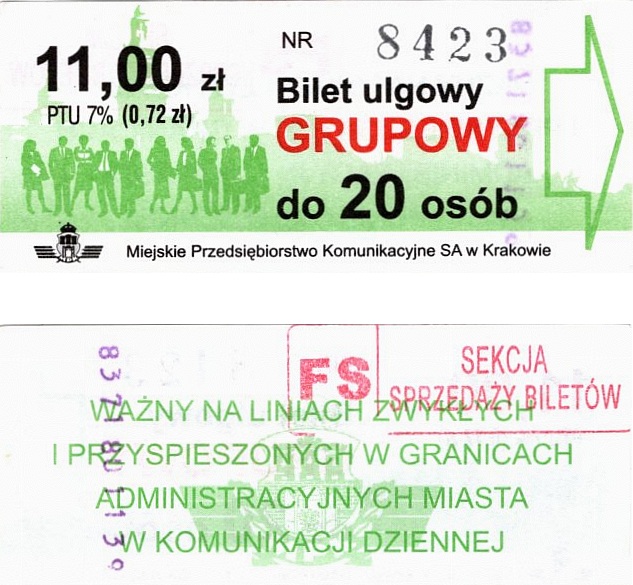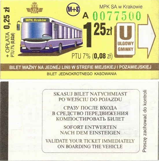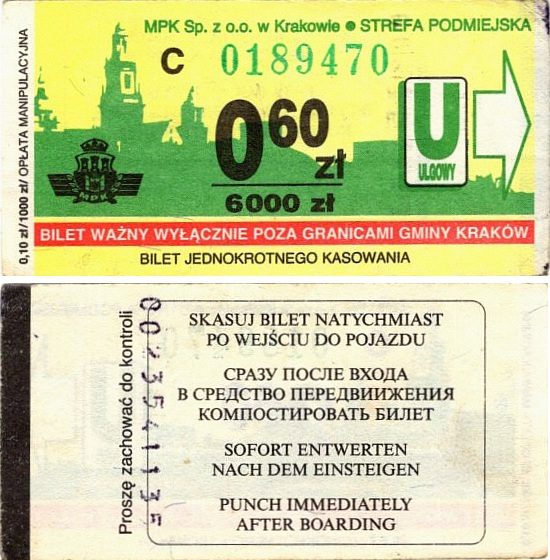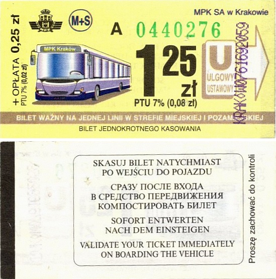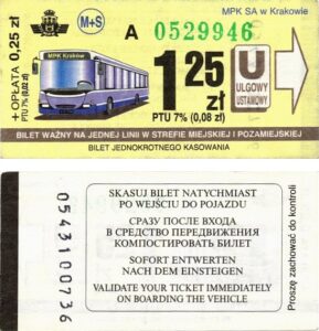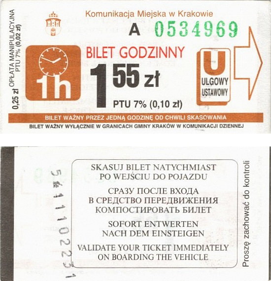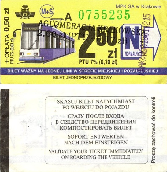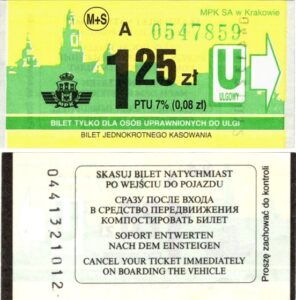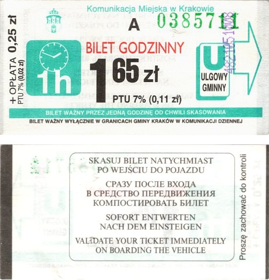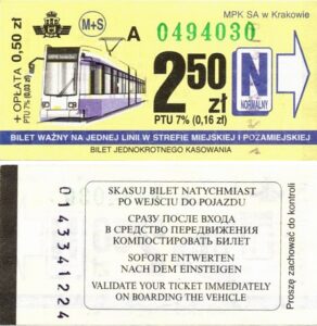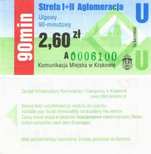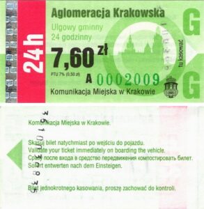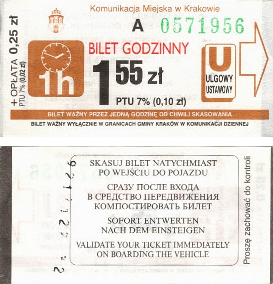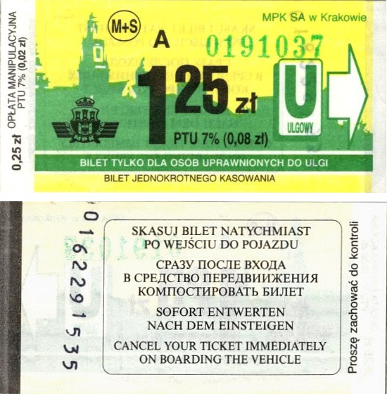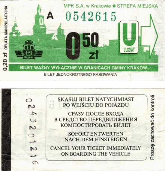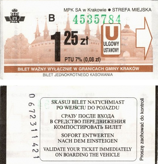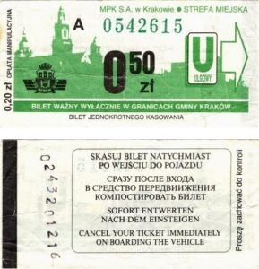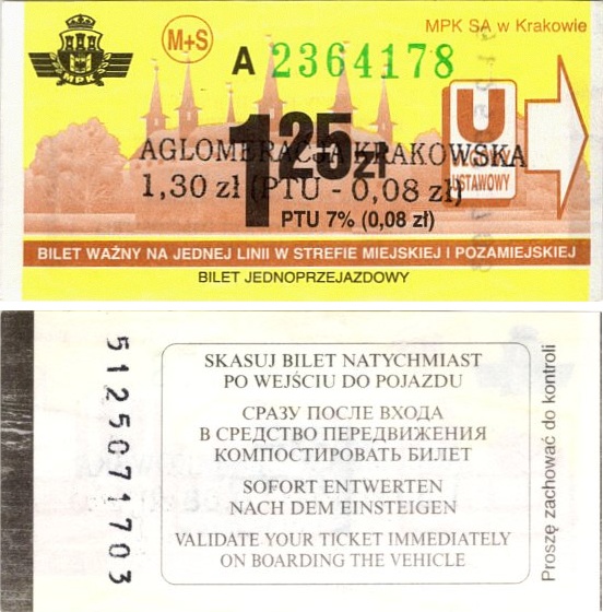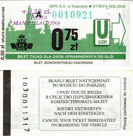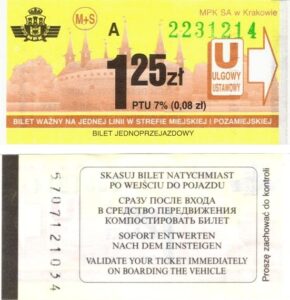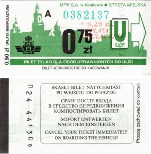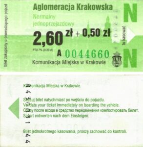 [Bilety o nominale 1,25 i 2,50 (ze stemplami: „AGLOMERACJA KRAKOWSKA”) były obecne w taryfie 01.01.2008-03.08.2011; bilet UG pochodzi z cennika 15.01.2005-31.12.2007]