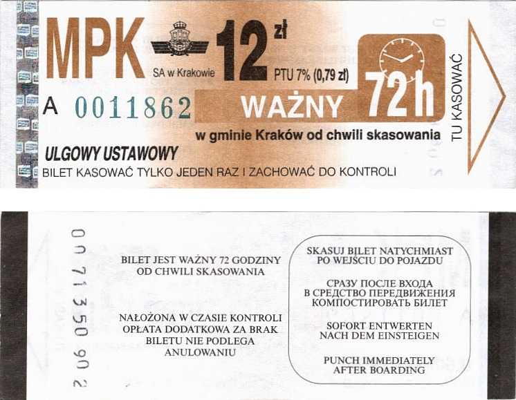 Uwaga: w biletach nocnych: Jęz. angielski: Punch immediately after boarding; Proszę zachować do kontroli z prawej strony na rewersie