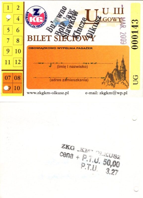 - Katedra, logo ZKGKM, herb powiatu olkuskiego, w tle rozeta, hologram z wzorkami: