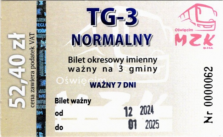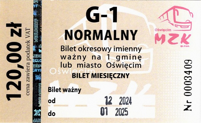 - Logo MZK, oznaczenia ważności, srebrny hologram + w tle napisy WĘGLOGRYF: