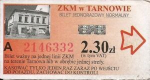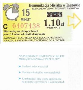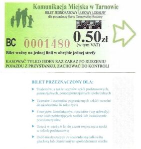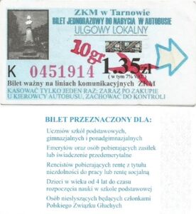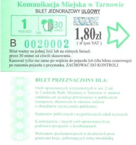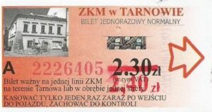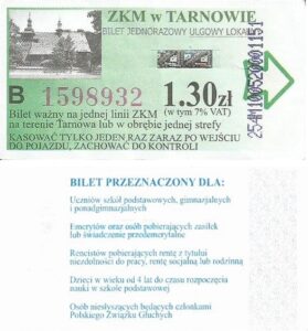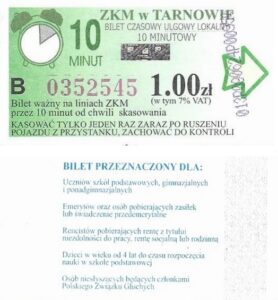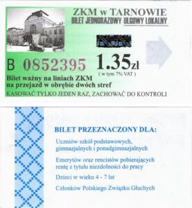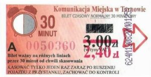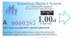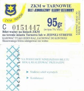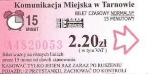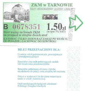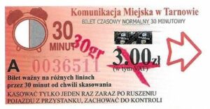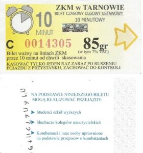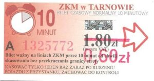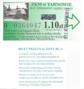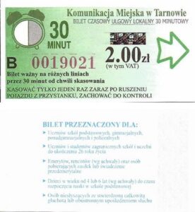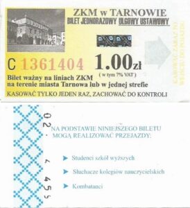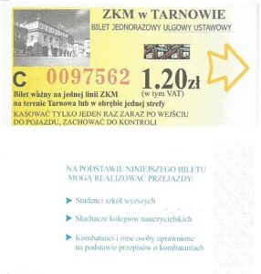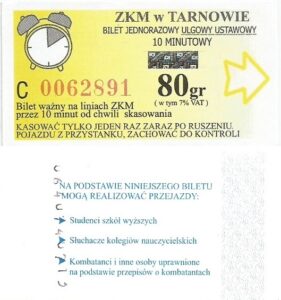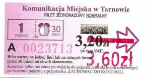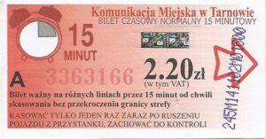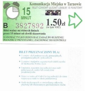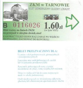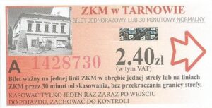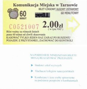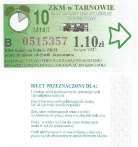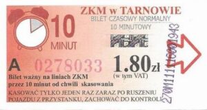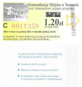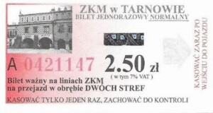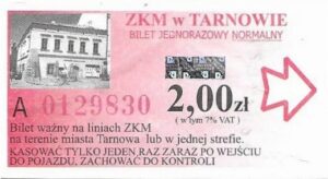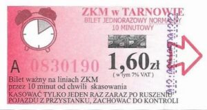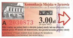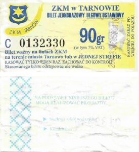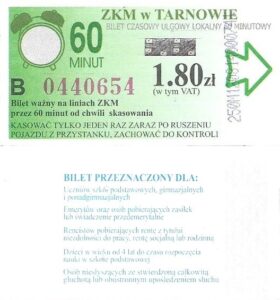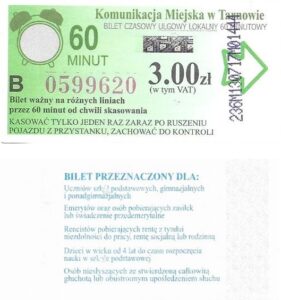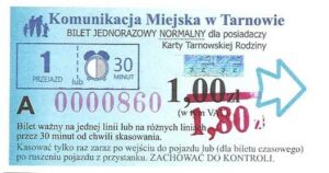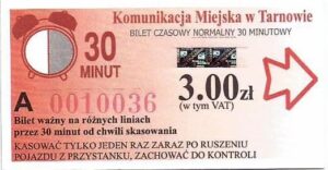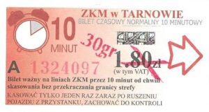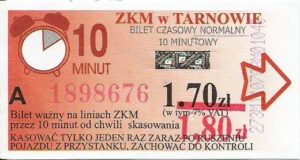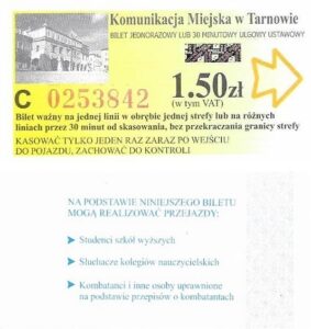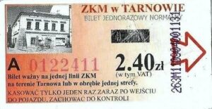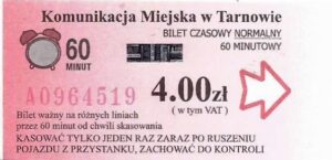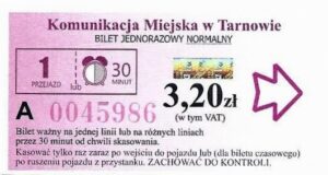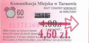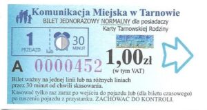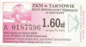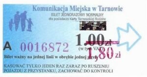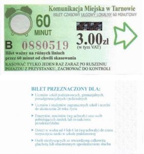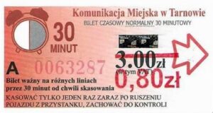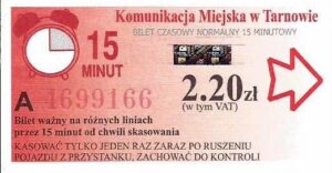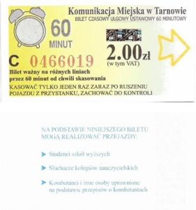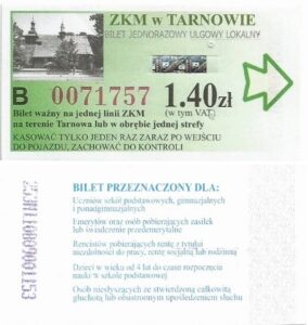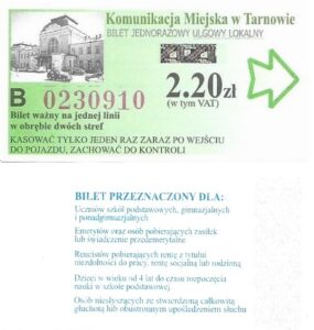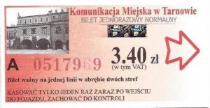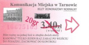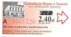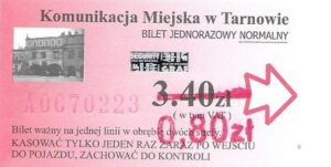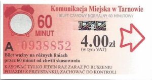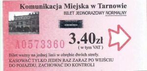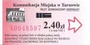- Komunikacja Miejska w Tarnowie, obrazek w lewym górnym rogu, kolorowe tło, strzałka z prawej strony biletu [kontur koloru tła], hologram DKK, w tym VAT: