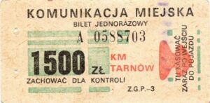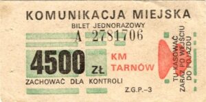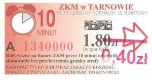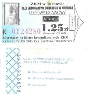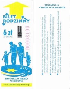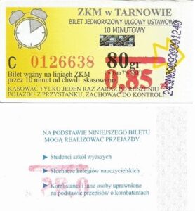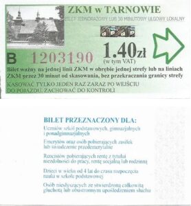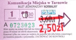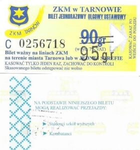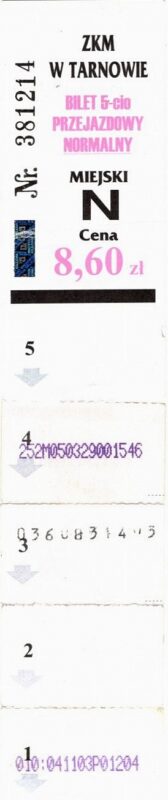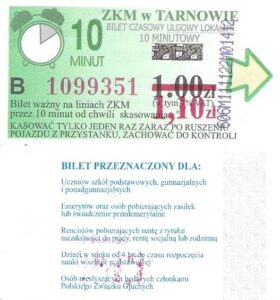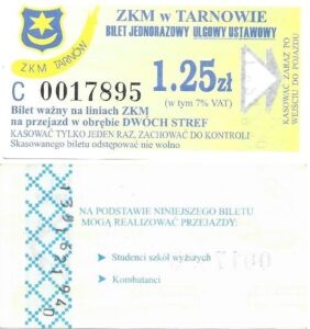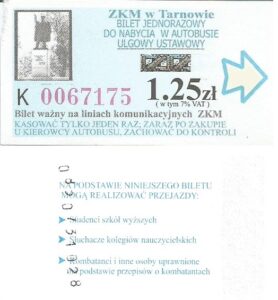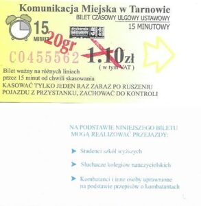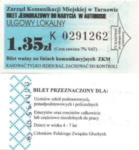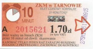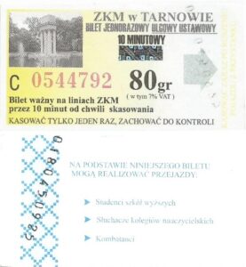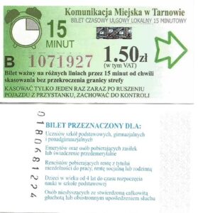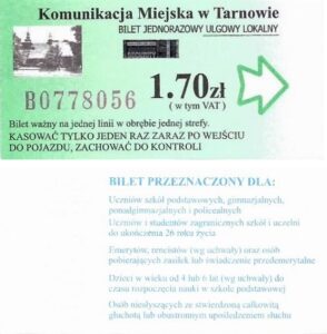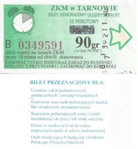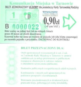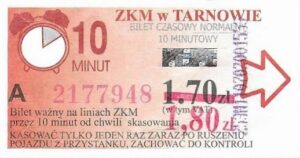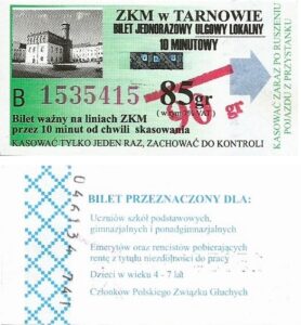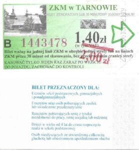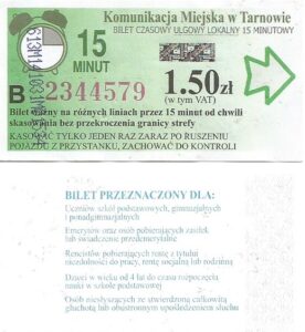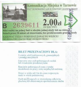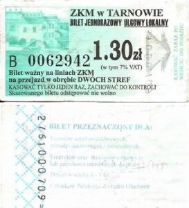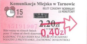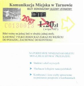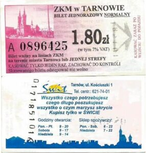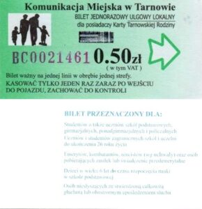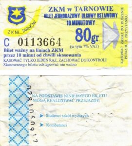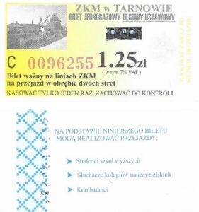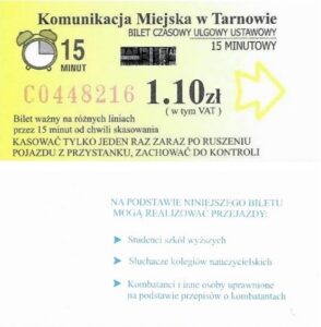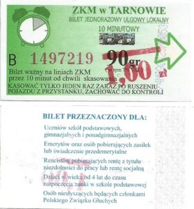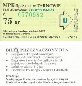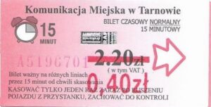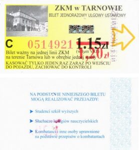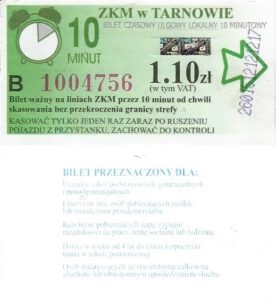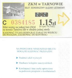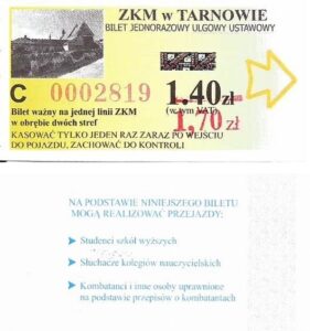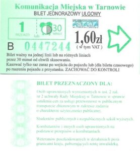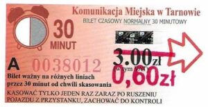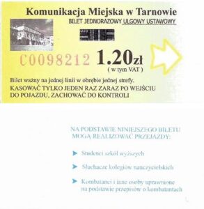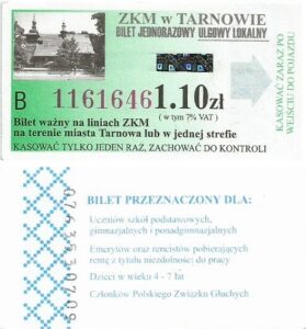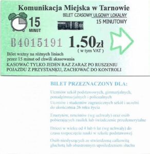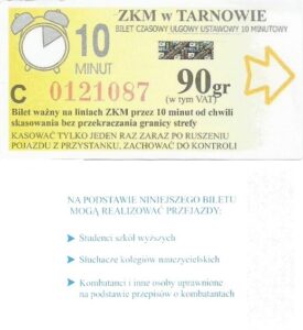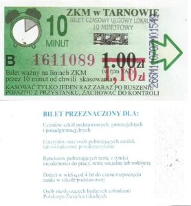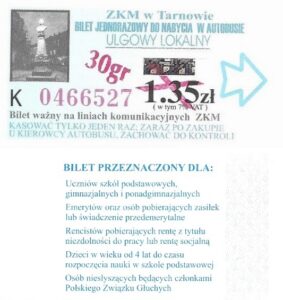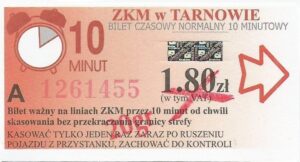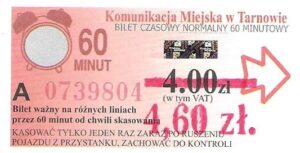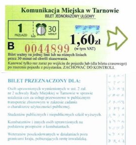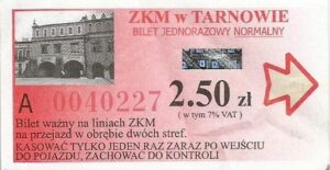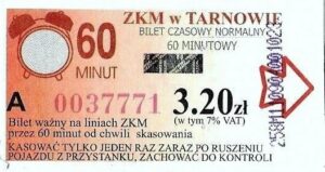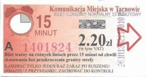 - Komunikacja Miejska w Tarnowie, obrazek w lewym górnym rogu, kolorowe tło, strzałka z prawej strony biletu [kontur koloru tła], hologram DKK, w tym VAT: