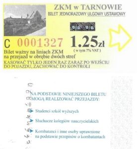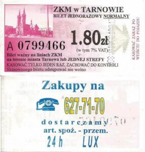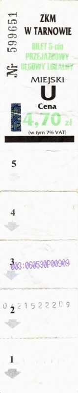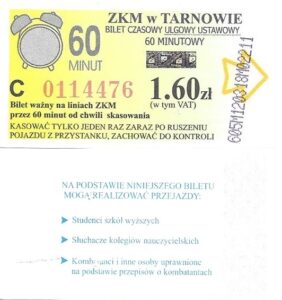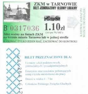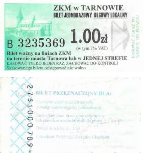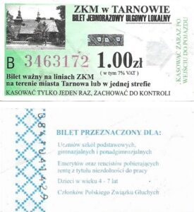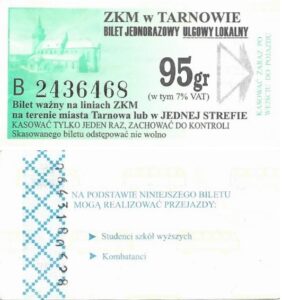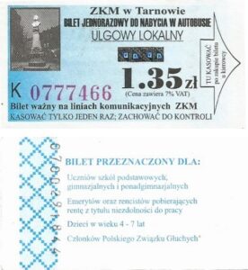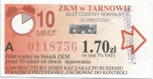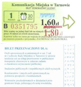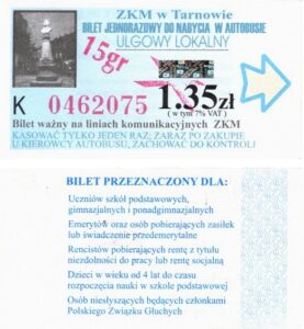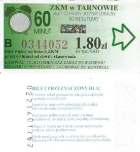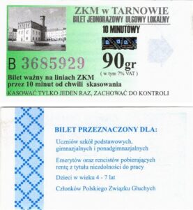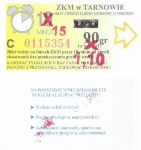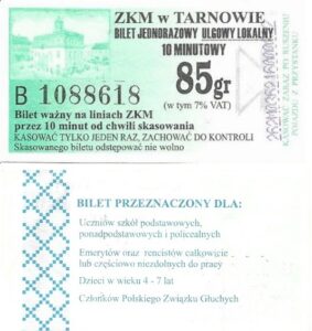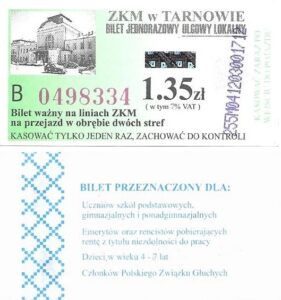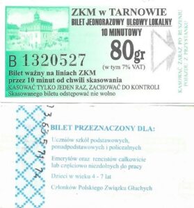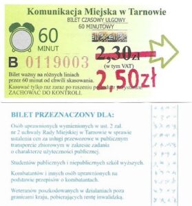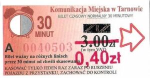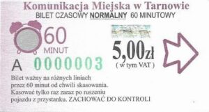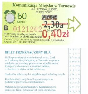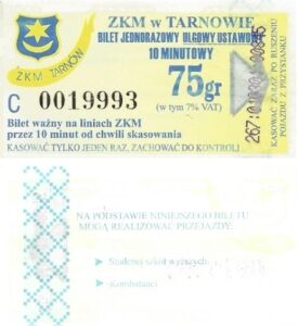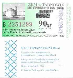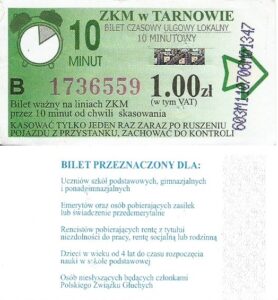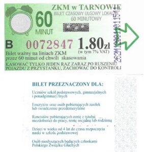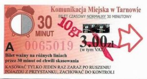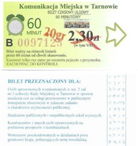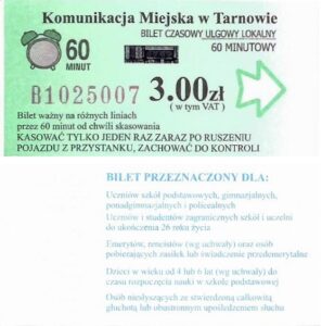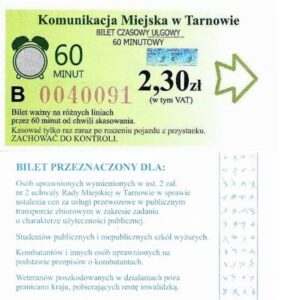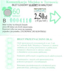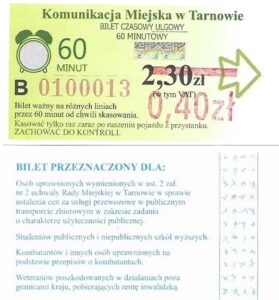 - Komunikacja Miejska w Tarnowie, oznaczenie zakresu ważności biletu, w tym VAT, hologram DKK: