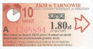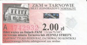 - ZKM w Tarnowie, obrazek w lewym górnym rogu, kolorowe tło, strzałka z prawej strony biletu [kontur koloru tła], hologram DKK, w tym VAT: