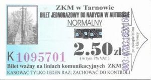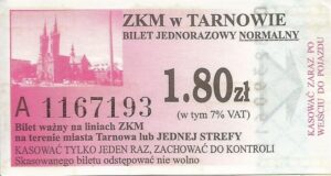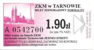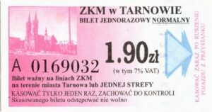 - ZKM w Tarnowie, obrazek w lewym górnym rogu, kolorowe tło, szara strzałka z prawej strony biletu, hologram DKK, w tym 7% VAT: