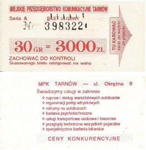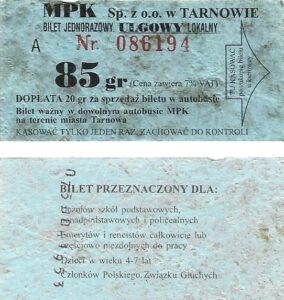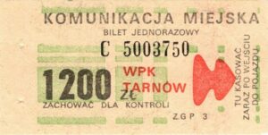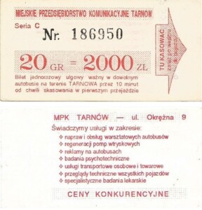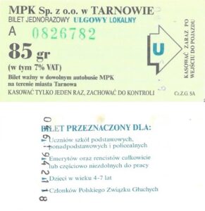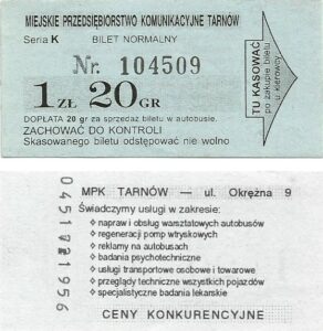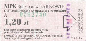 - MPK Sp. z o.o. w Tarnowie, numerator nad ceną, U/N w strzałce, w tym 7% VAT, małe Cz.Z.G. SA:
